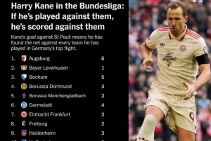 2023年夏天加入拜仁后,凯恩在德甲一共面对过19支球队,在昨天的比赛之前,只有圣保利还没有被他进过球,而现在对圣保利破门后,凯恩已经对自己德甲生涯遇到过的所有对手都进过球了。